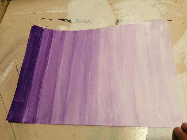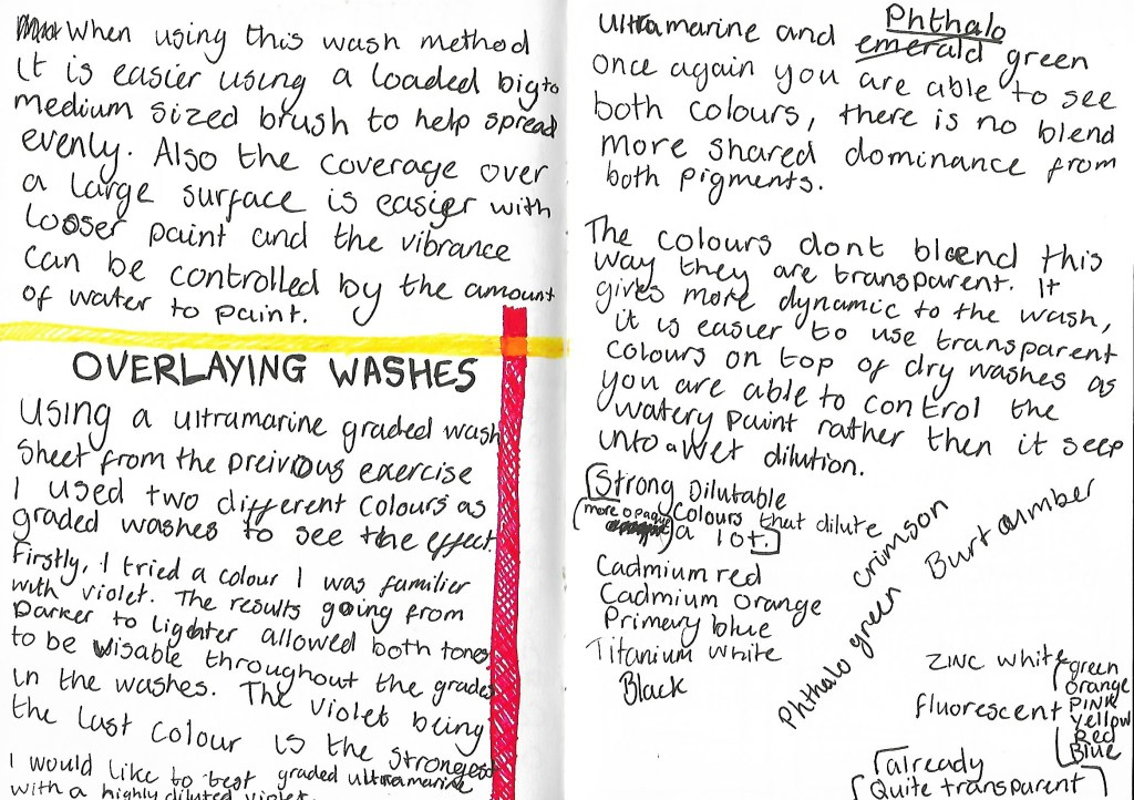 Overlaying washes – Using dried sheets from the previous exercise I tested violet & phthalo green as graded washes in the opposite direction this allowed me to see the strengths against their opposites and how different colours can react. Dry wash overlaying, does not let the colours blend rather it allows the layers to be seen.