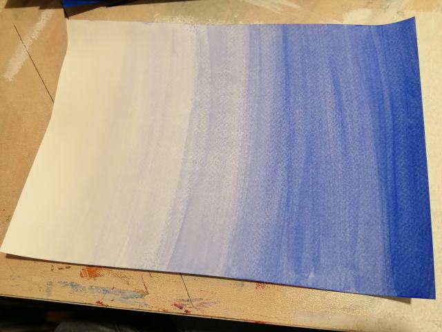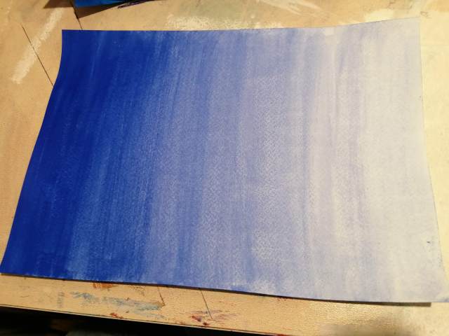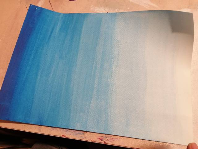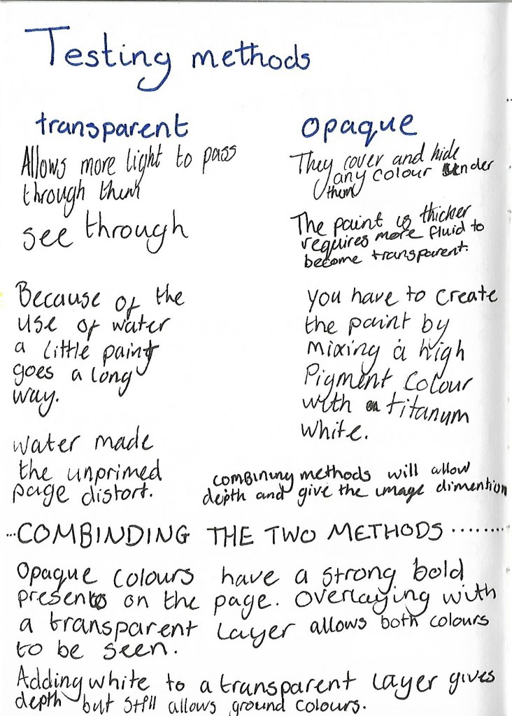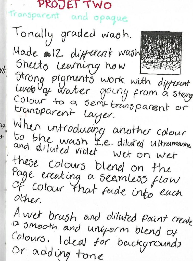 I started this project focusing on creating the transparent graded sheets, I chose to use strong pigmented colours; Ultramarine, Phthalo Green, Violet and to test colour difference Primary Blue. Creating the different levels of watery mixtures from a strong, vivid opaque colour, to semi-transparent, then to a transparent colour was informative.