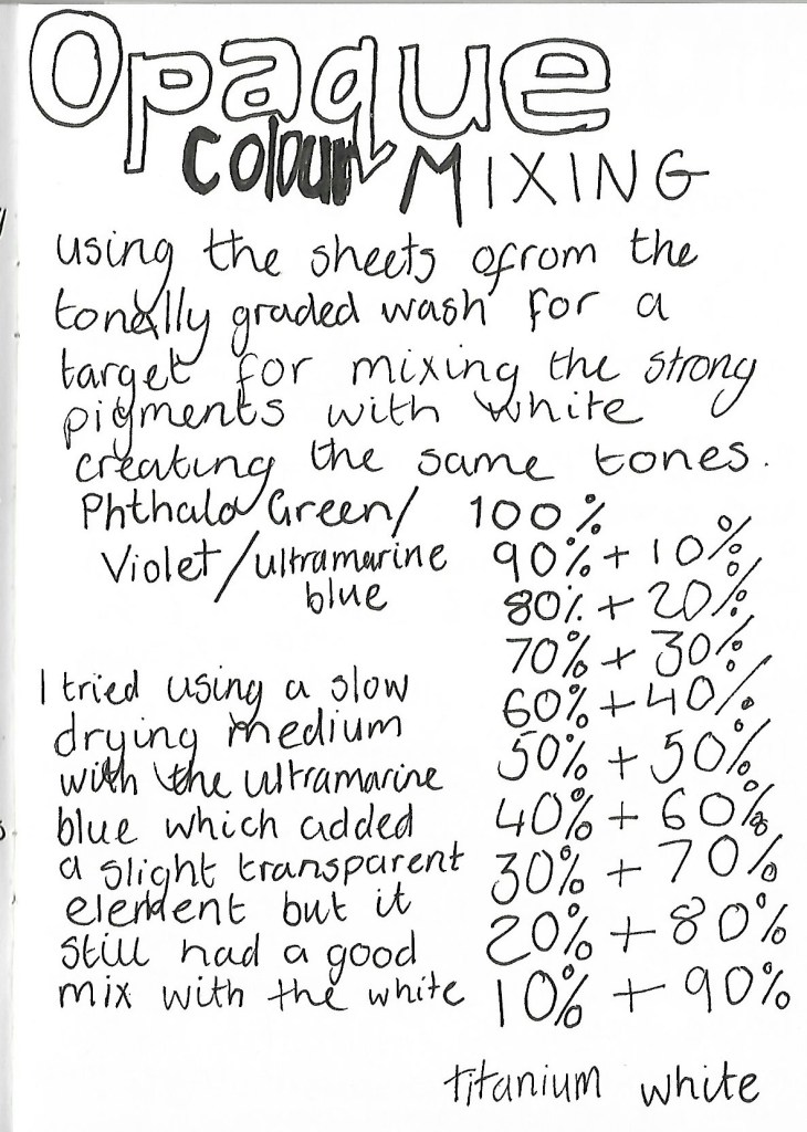 Creating the opaque tonal graded sheets, I used the same colours and transparent sheets as a reference. Starting with the strong colour first and working my way through the sheet mixing titanium white. The first sheet I tried began to dry while painting due to the thick pigment and lack of water so I tried mixing a slow drying medium to the next test. The results added a slight transparency to the tone. I found it a lot easier to complete the sheets with the medium. This allowed me to create weaker pigmented tones that still had strength in colour