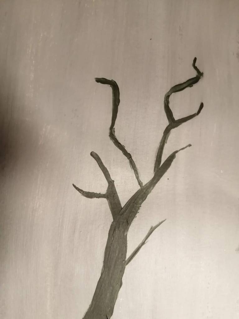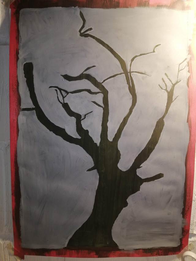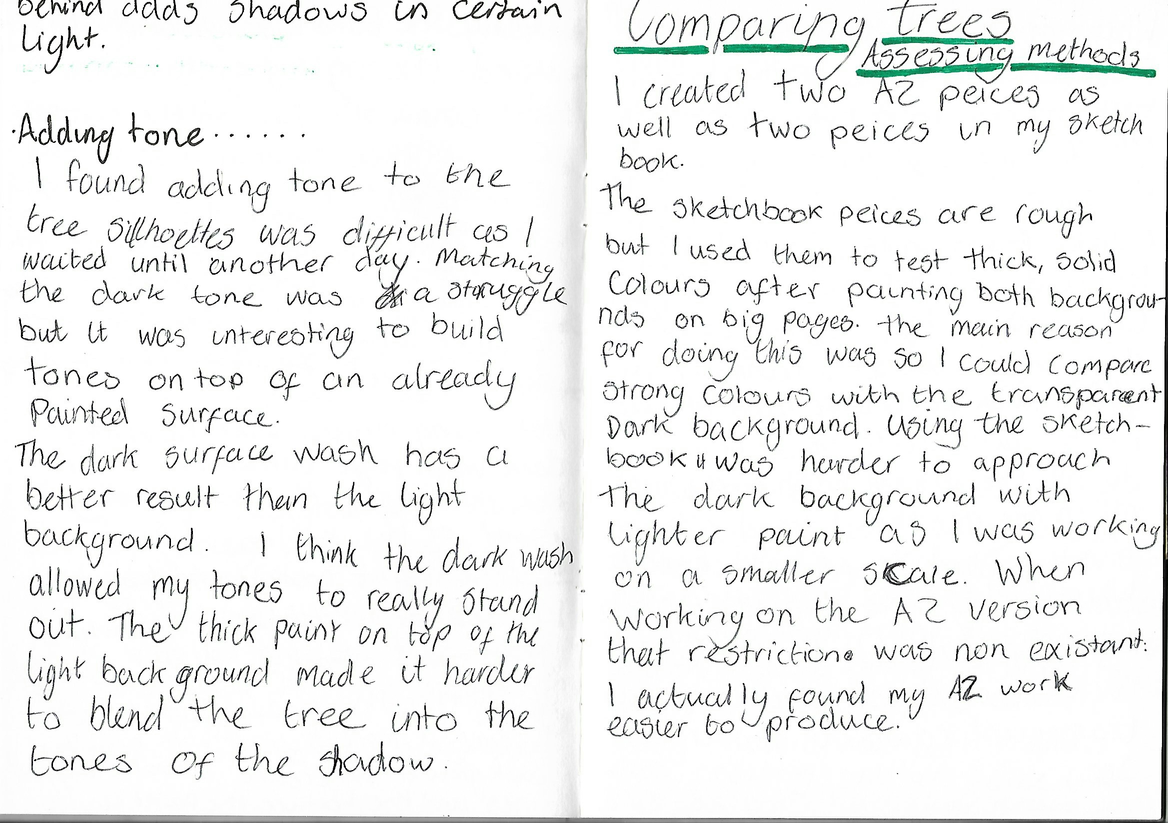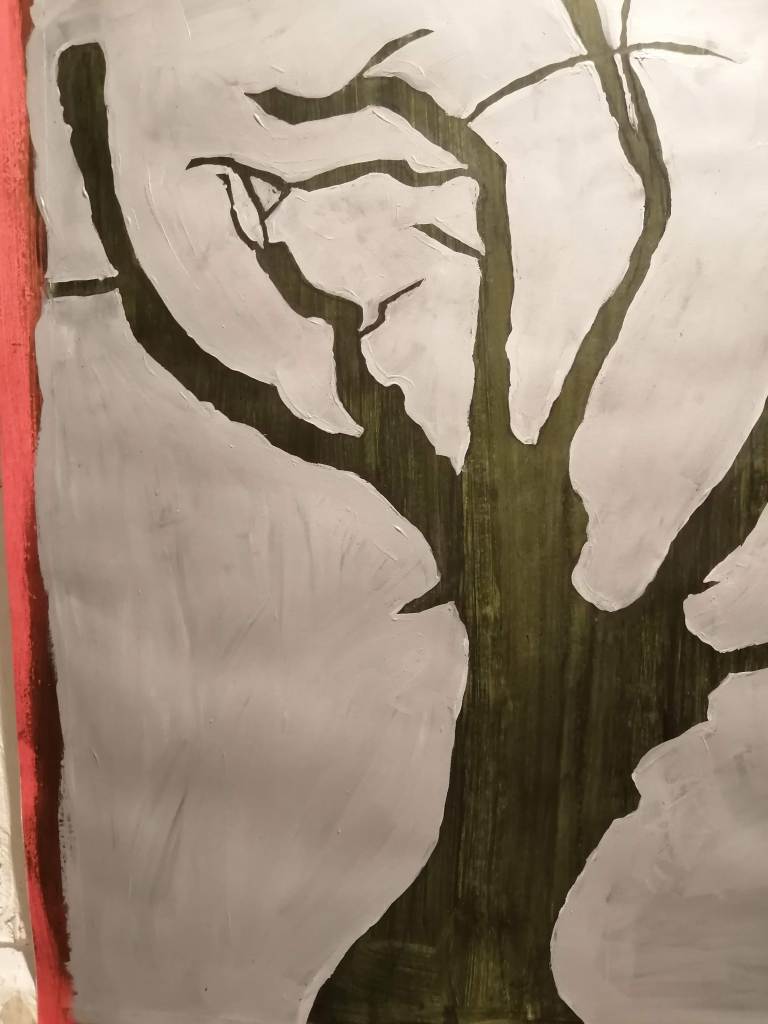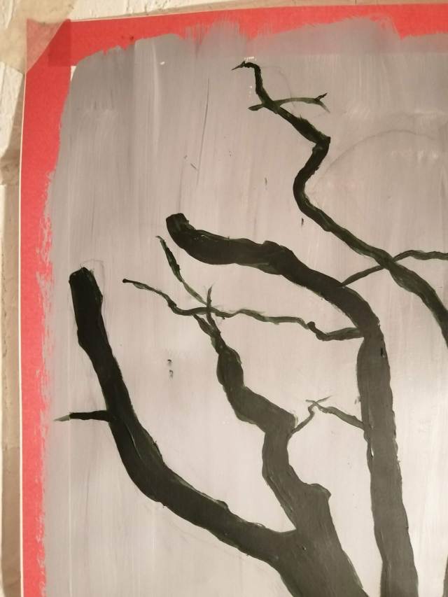 I found adding tone to the tree silhouettes was difficult as I had to match dry tones to wet paint. I really enjoyed building tones on top of dry paint once I eventually matched the tones. The dark wash allowed the tones to stand out. The thick paint on top of the light background made it harder to blend the tree into the tones of the shadow