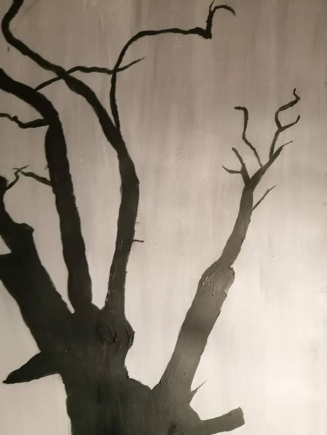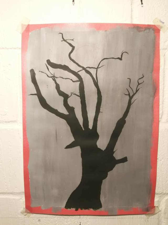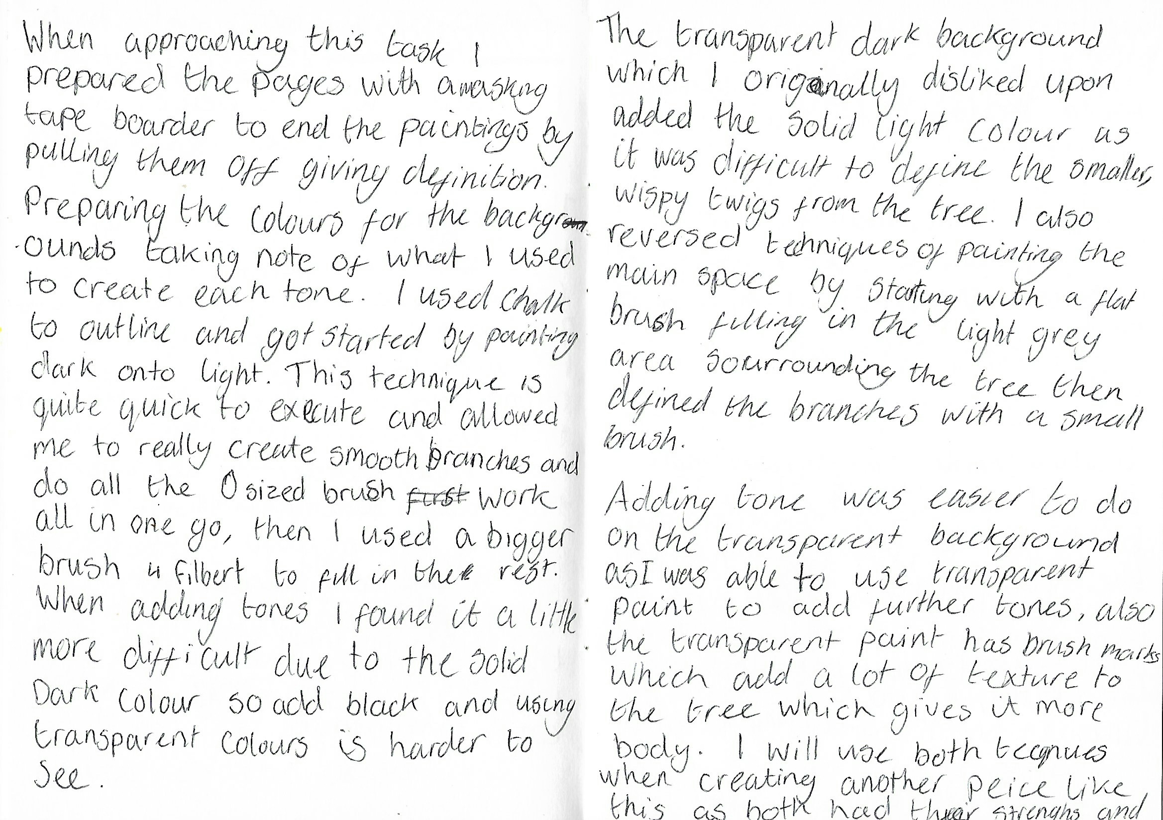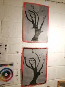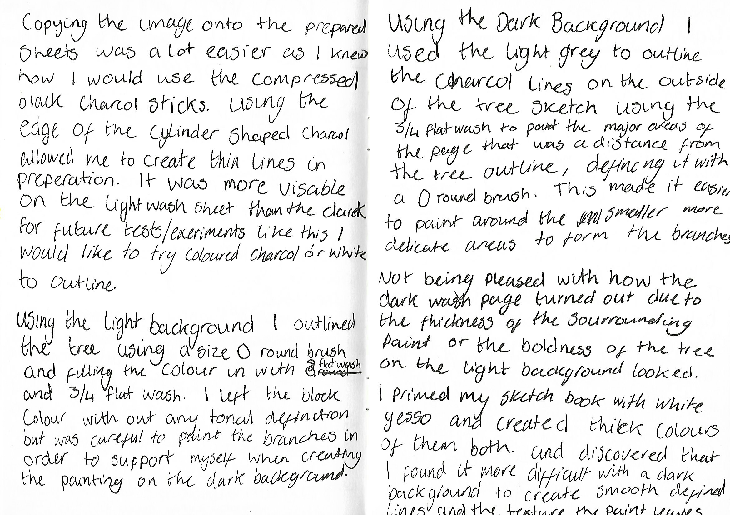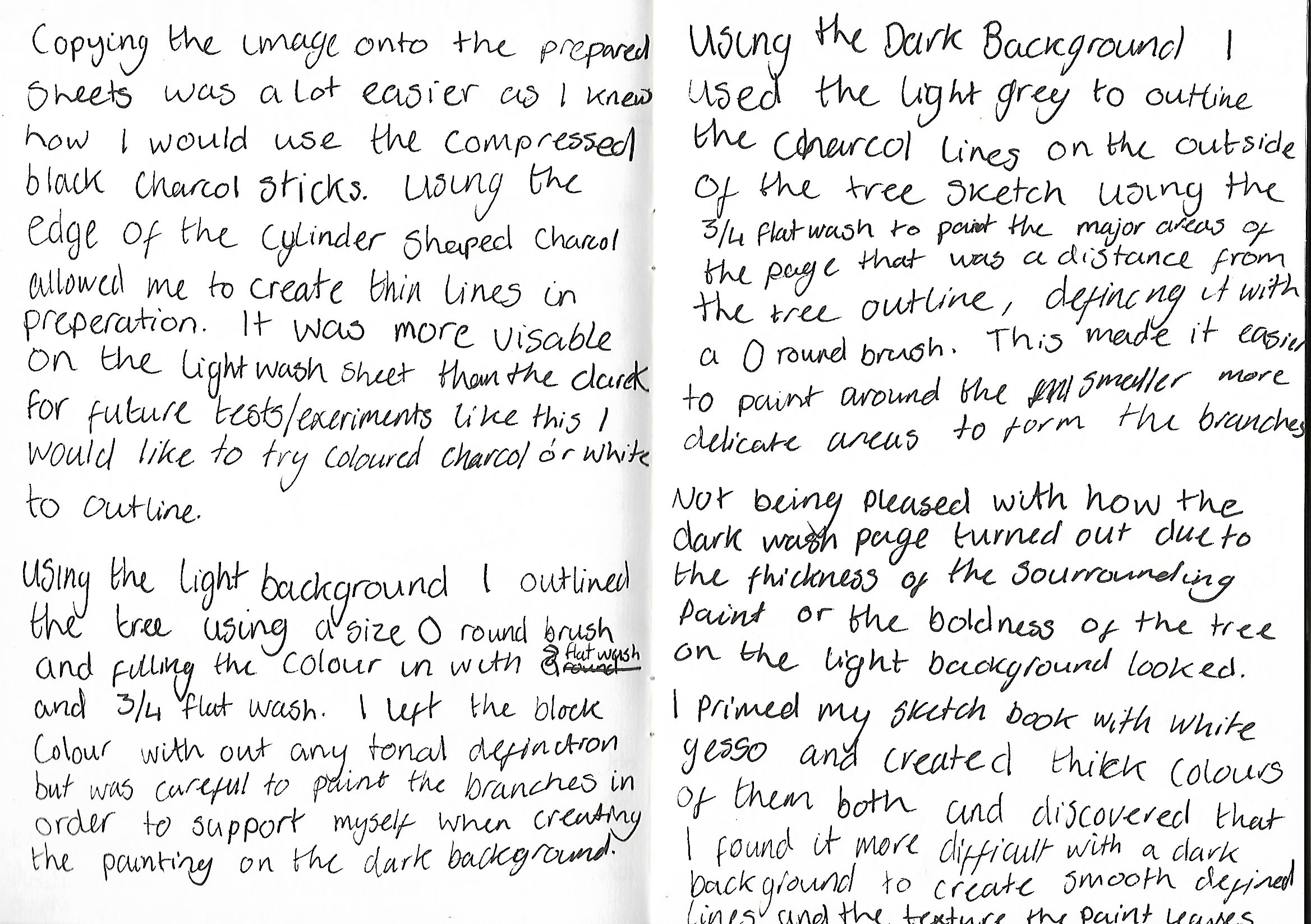 I used the sketchbook pieces are rough but I was able to test the thick and solid colours after painting the transparent A2 dark background. I did this to compare strong colours with the transparent dark background with lighter paint as I was working on a smaller scale. When working in the A2 version that restriction was non existent., I found the A2 work a lot easier to produce as the fine-lines could be done with an average small brush. I prepared the colours for the backgrounds and applied the paint leaving a smooth surface behind to create a easy surface to draw on with chalk. The chalk drawing made painting dark on to light a lot easier as I could paint directly with a small brush to create smooth branches. The transparent dark background allowed me to be able to really create shadows and tones that represent the tree, although I found it more difficult to define the smaller, wispy twigs from the tree. Reversing the techniques for the light washed piece, I used transparent paint on-top of the opaque tree outline allowed me to add tones and texture with the brush marks.