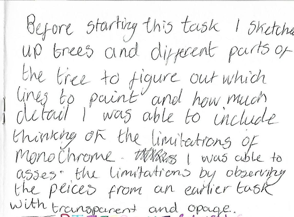 Overall, I think I approached this task slightly bewildered and it took me a lot longer to complete then other work so far. I believe this is because of I found adding tones on each piece needed different techniques. Adding tone to the transparent background proved simpler as the surface was more textured and gave the image more body. The limitations of these monochrome techniques proved to be in the planning and analysing of the image. If I spent more time analysing the direction and shadow of the branches and bark.