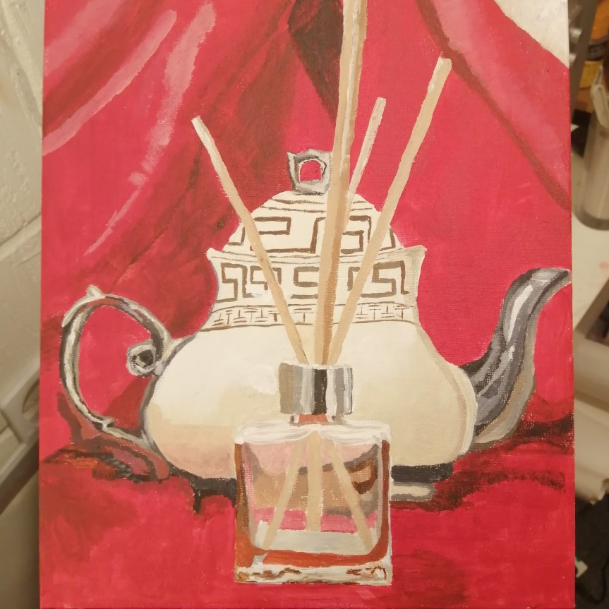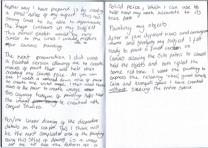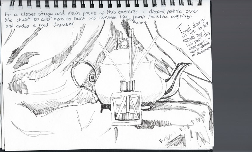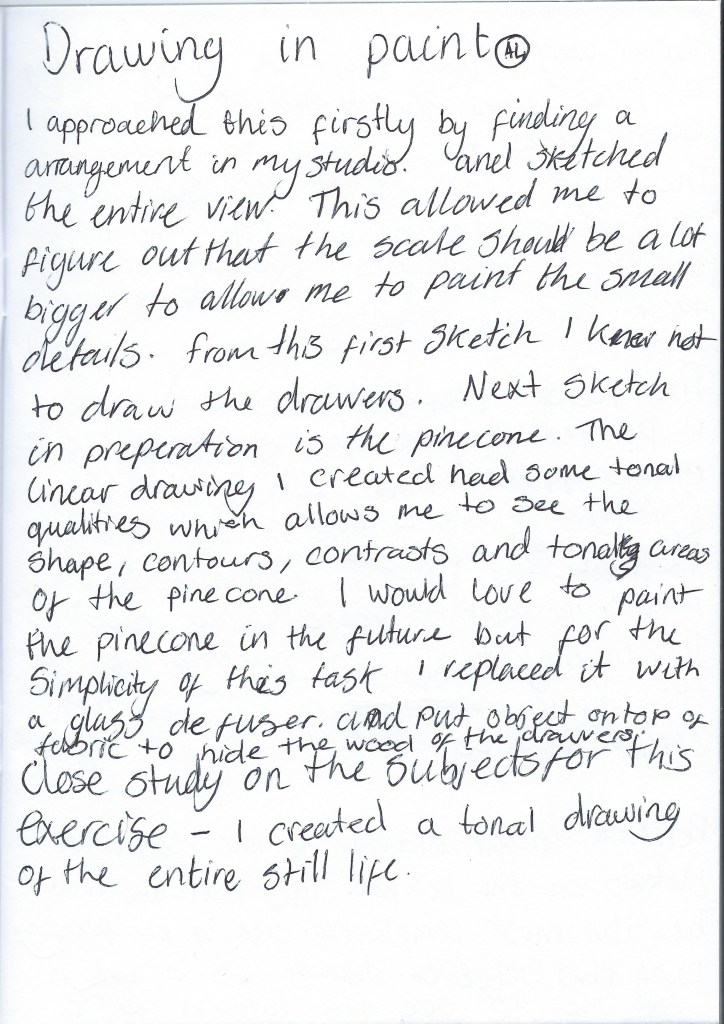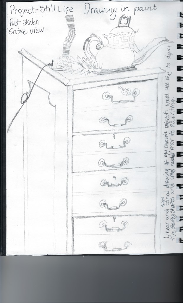 I approached this task by firstly finding an arrangement in my studio and sketched the entire view this allowed me to figure out the scale should be a lot bigger to allow me to paint the smaller details from this first sketch I knew not to draw the drawers and in preparation