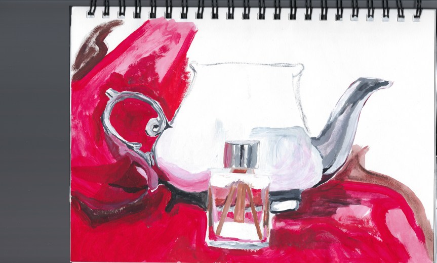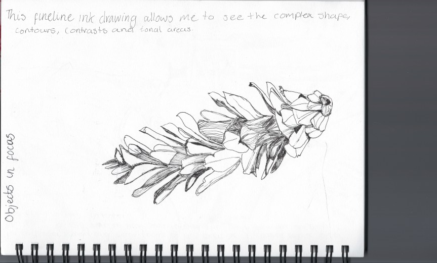 My next preparation sketches are of the pine cone. It’s a linear drawing, I created it with some tonal qualities which allow me to see the shape, contours, contrasts and tonal areas of the pine cone. This sketch allowed me to see that it may be a bit too complicated and for simplicity of this task. I will choose a different subject to sit with the teapot.
