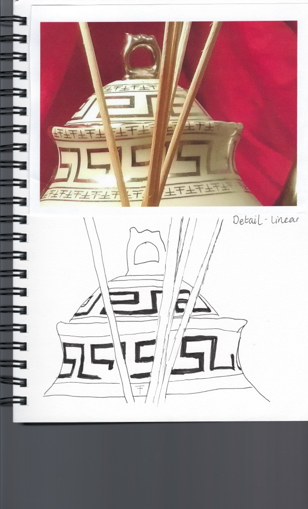 I have created a small detail linear drawing of the decorative details on the teapot as this is something Kai avoided painting in the previous task I feel that it will be a complicated area of the painting doing this style of drawing allows me to really focus on the pattern as a solid piece which I can use to help keep my work accurate too it truthful form.