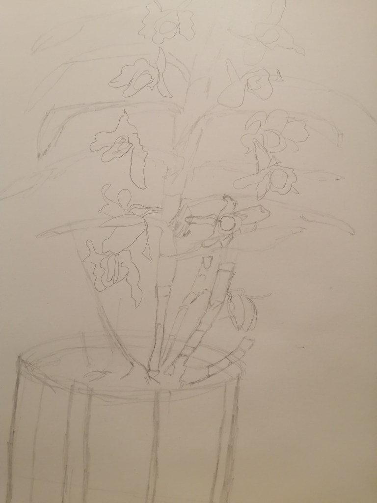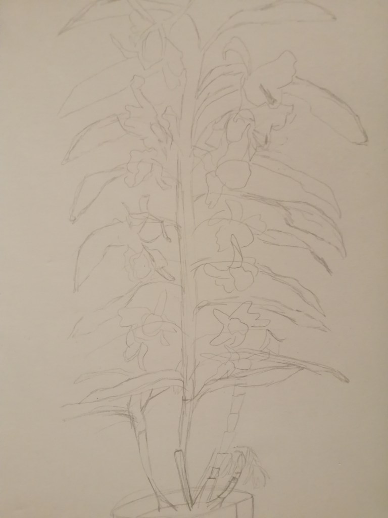 The second sketch is to scale for the size of the page. It was nice to be able to focus on the shape and lines. It gives me a reference to being able to create such a difficult flower into a painting. This sketch allows me to see the negative spaces between the leaves and flowers.