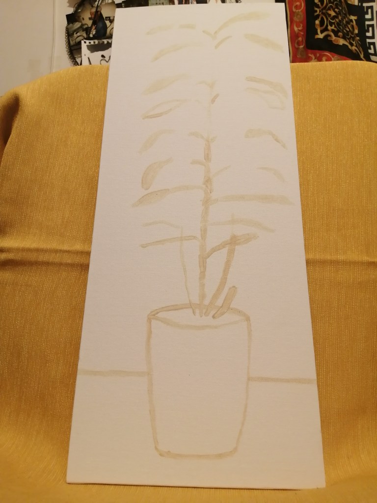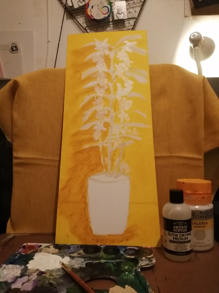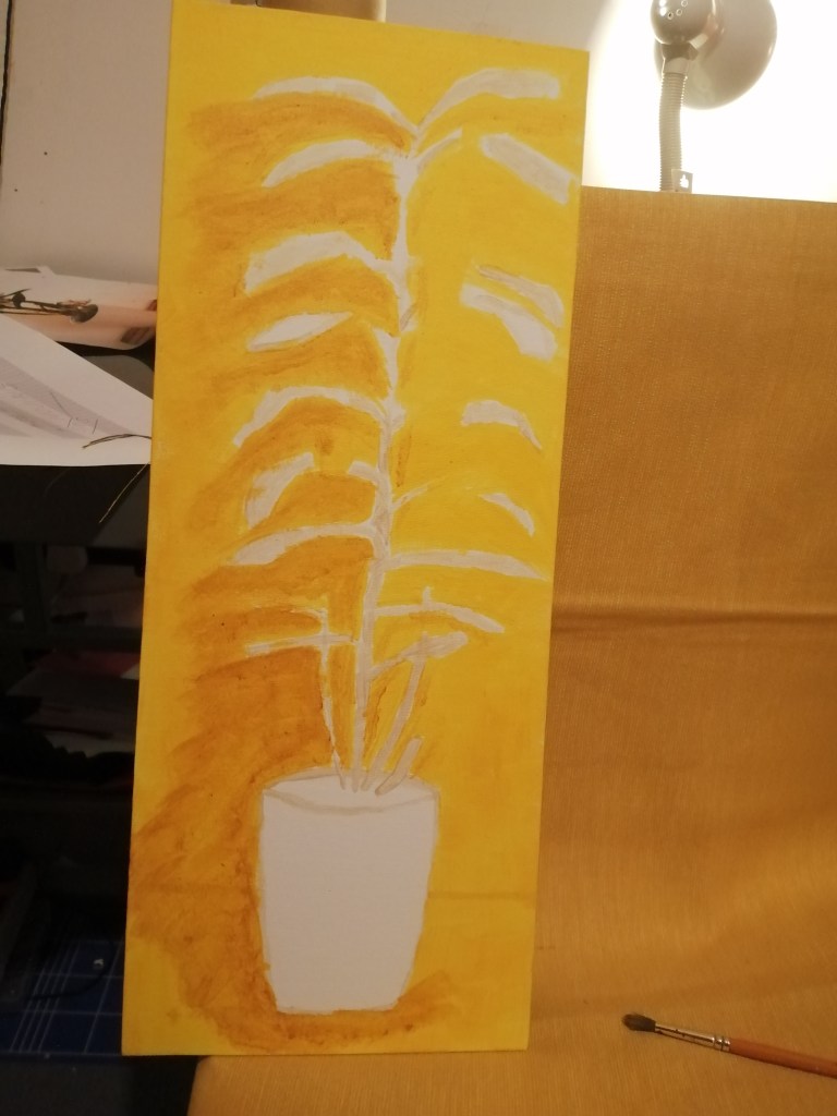 I started making this painting by drawing in watered down paint. I painted the lines of where the leafs would be, following their individual shapes. I painted the yellow background early on which allowed me to focus on what I considered to be the most difficult part the flowers. I created this painting in layers starting with the white of the flowers. I spent time really trying to get to outline of each flower. This allowed me to really see where each petal changes colours and shows where leaves and flowers will overlap. I also painted the vase.