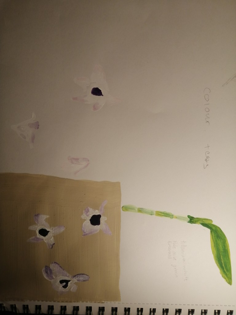 I attempted to test the colouring on this image on a white background as that’s where my Flowers have been sitting And I found it quite hard too fully be able to define Flowers and make them visible on a white background I then created a buff titanium background to allow me to focus on the flower shapes and patterns colouring I also noted down the colours that I would be using for the still life of Flowers.