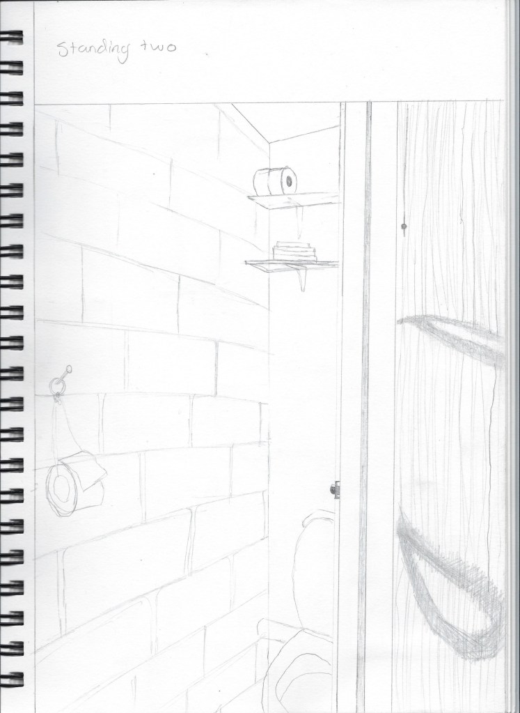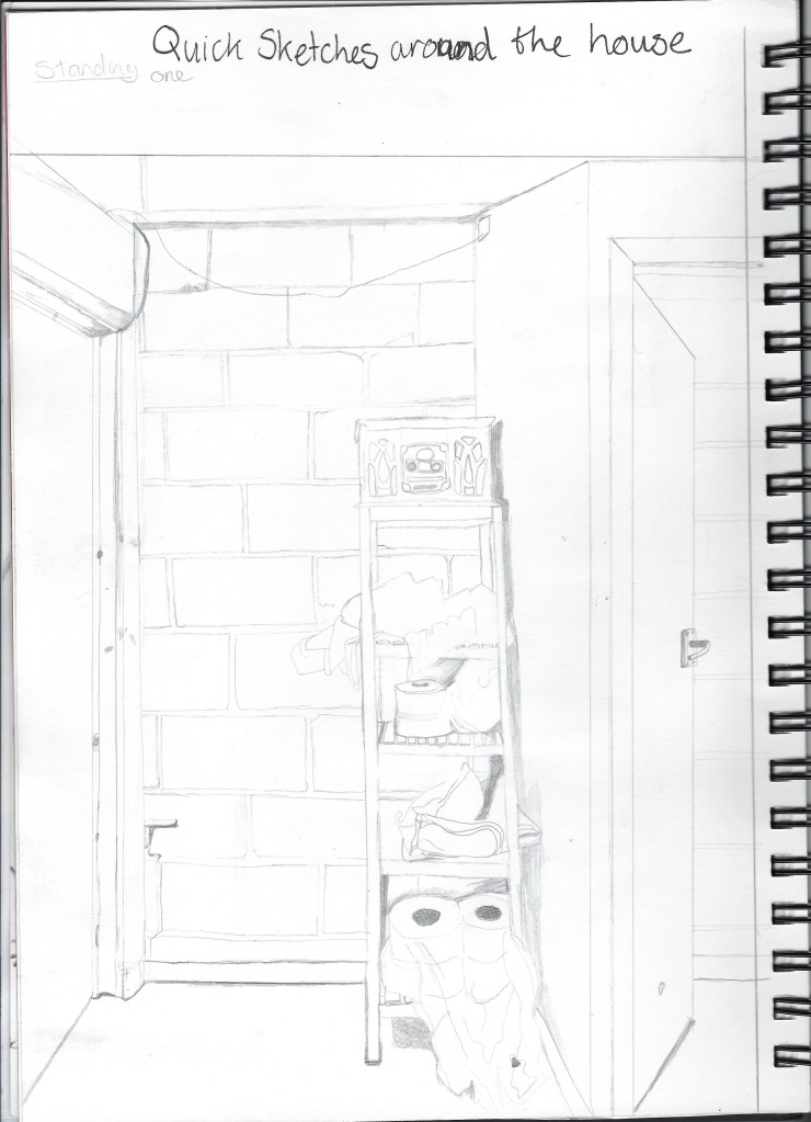This sketch was quite fun, I focused on an area that had plain walls, corners and a shelf. I feel like i have done a good job of creating accurate scale. The bag/packet of the toilet rolls is very flat and I do not think it looks very good because of the lack of shading. I also feel like the image is too flat.