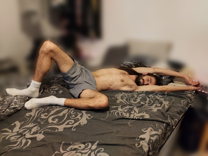 I use portrait pink to feel in the colour of my model’s main shape. I found painting my model’s main skin in a single tone is a really good way to create an accurate copy of the shape. I started by filling the space, then I defined the shape. I then used white and warm grey to define the pants shape and titanium white socks. I then stood back and took a good look at my painting and my photo and realise some areas could be better defined. I used warm grey to fill in the dark tones surrounding my model this allowed me to define the lines and also gave more definition to the painting as a whole. I used burnt amber with a touch of Mars black to paint the hair which is such a defining characteristic to my model giving such a loose painting/study some personality. Keeping to the linear aspect I wanted to add some tonal definition. I feel this actually adds to the linear aspect of my image gives hands and fingers some shape and allowed me to create a final piece.