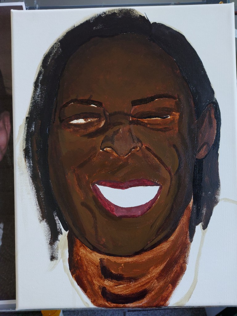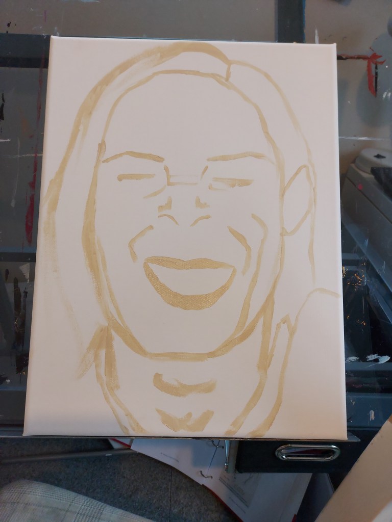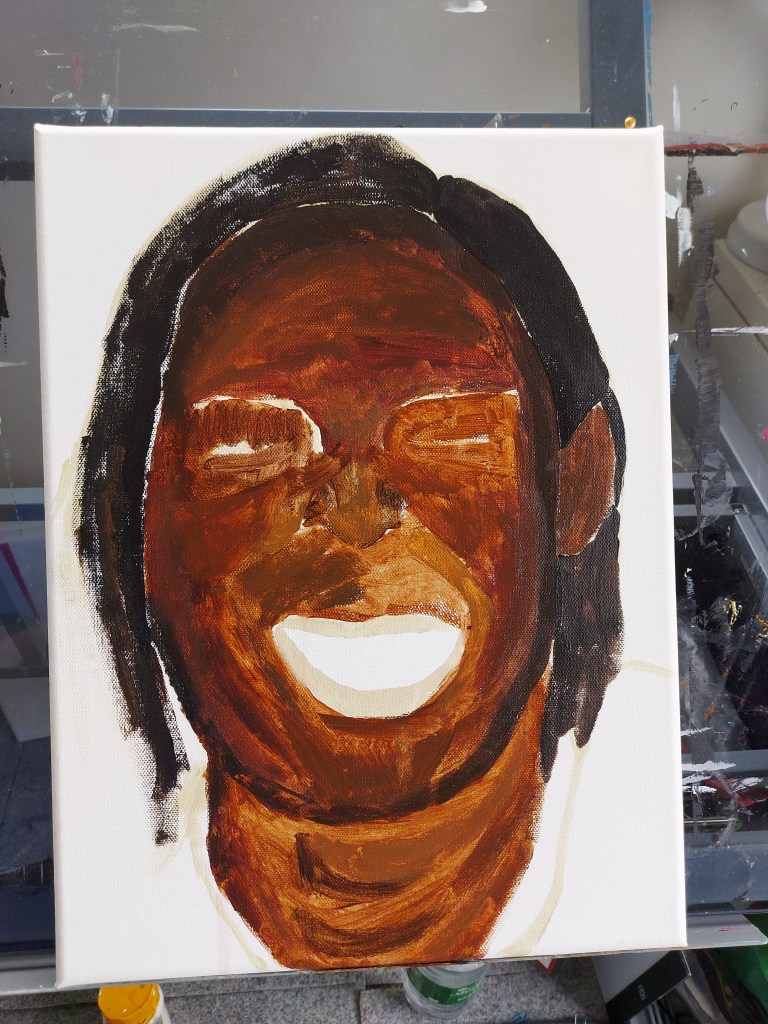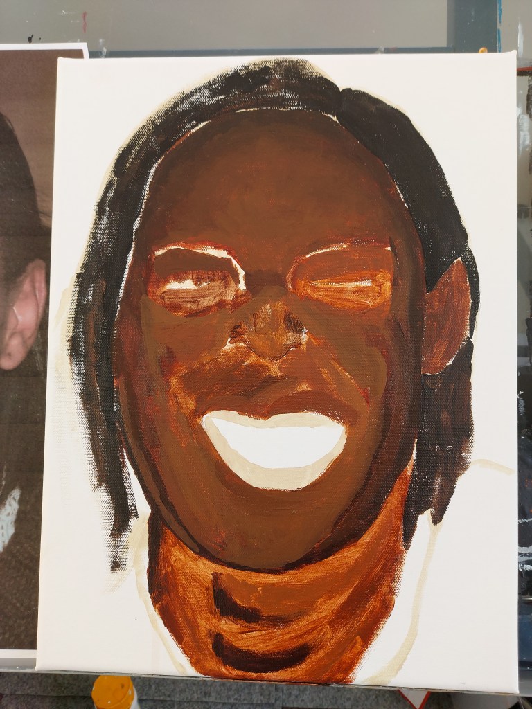 Next, I began to fill in my outline with a mix of colours. I created a pallette of burnt sienne, raw sienna, burnt umber, yellow ochre, vermillion and mars black. I painted the face, neck and my models hair filling in my shape while following the tones on the face.