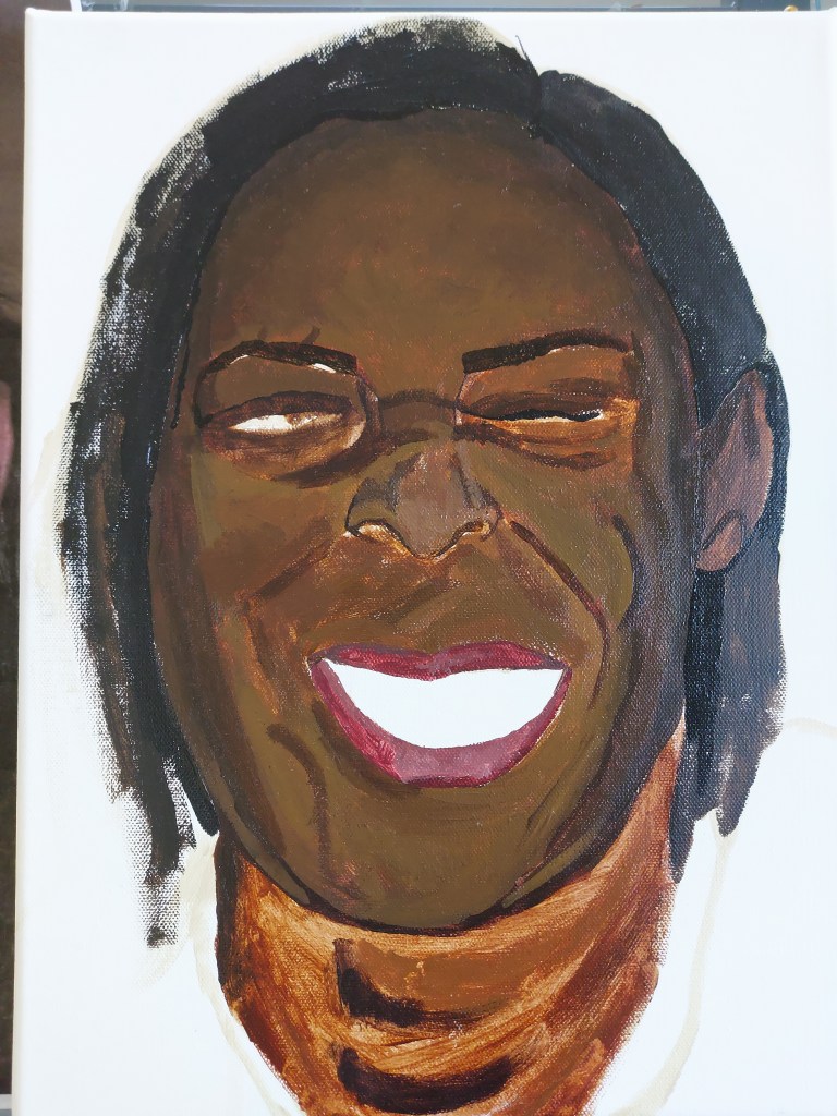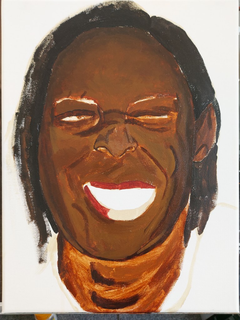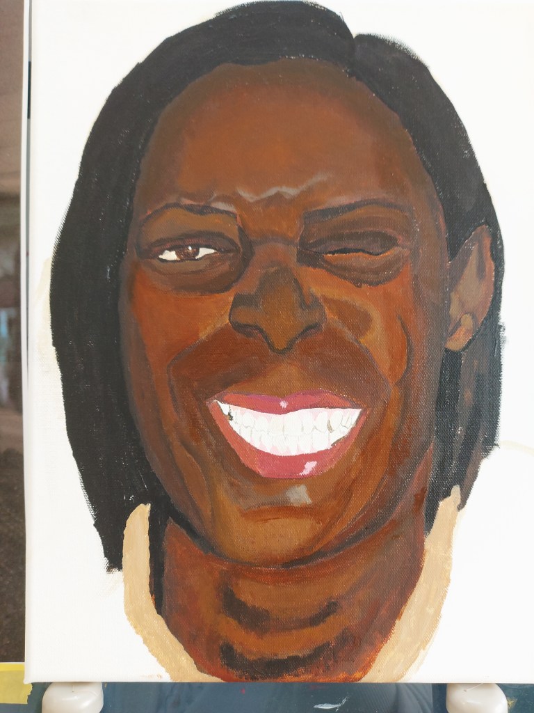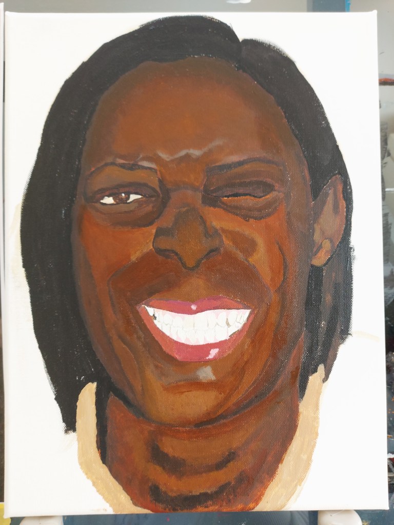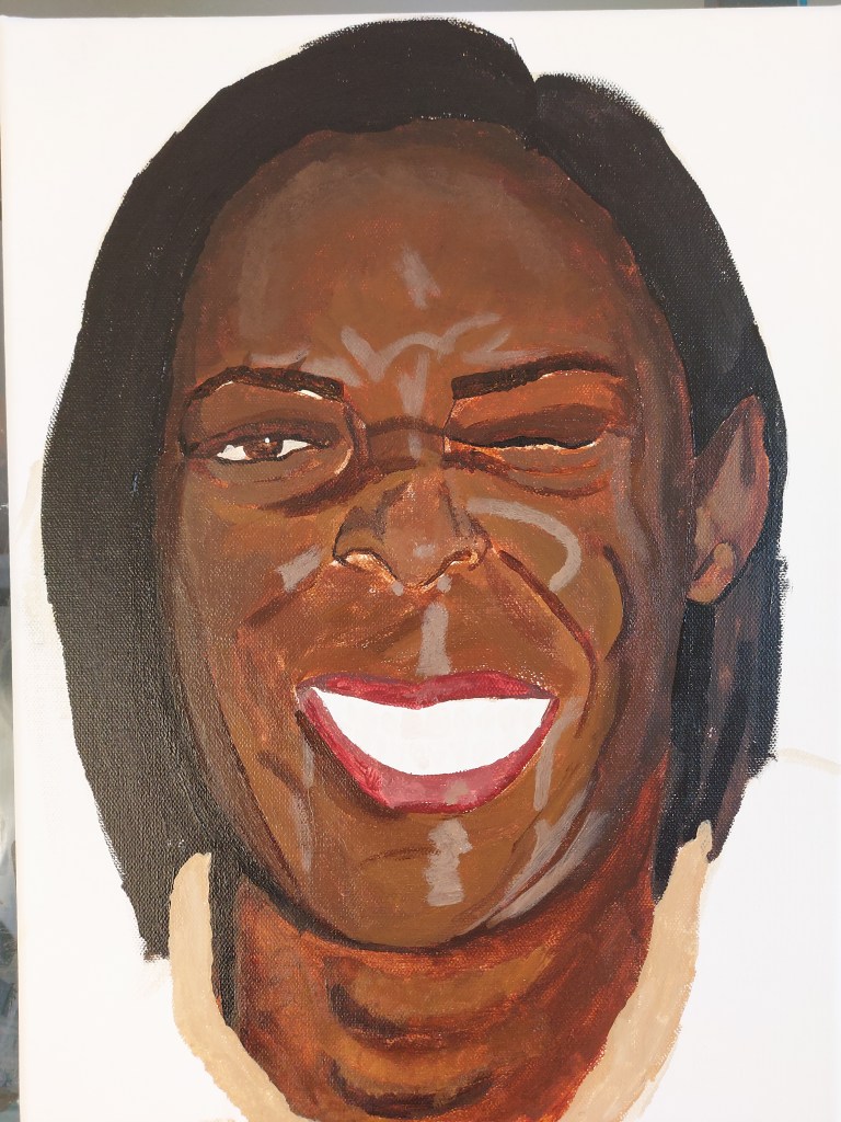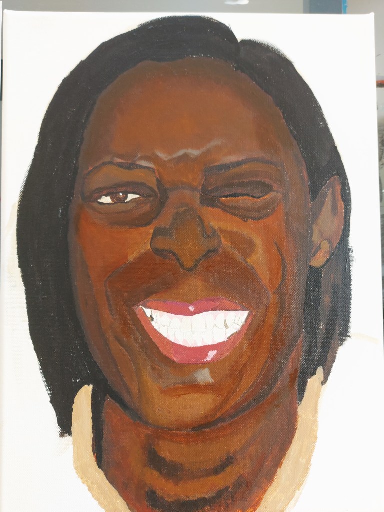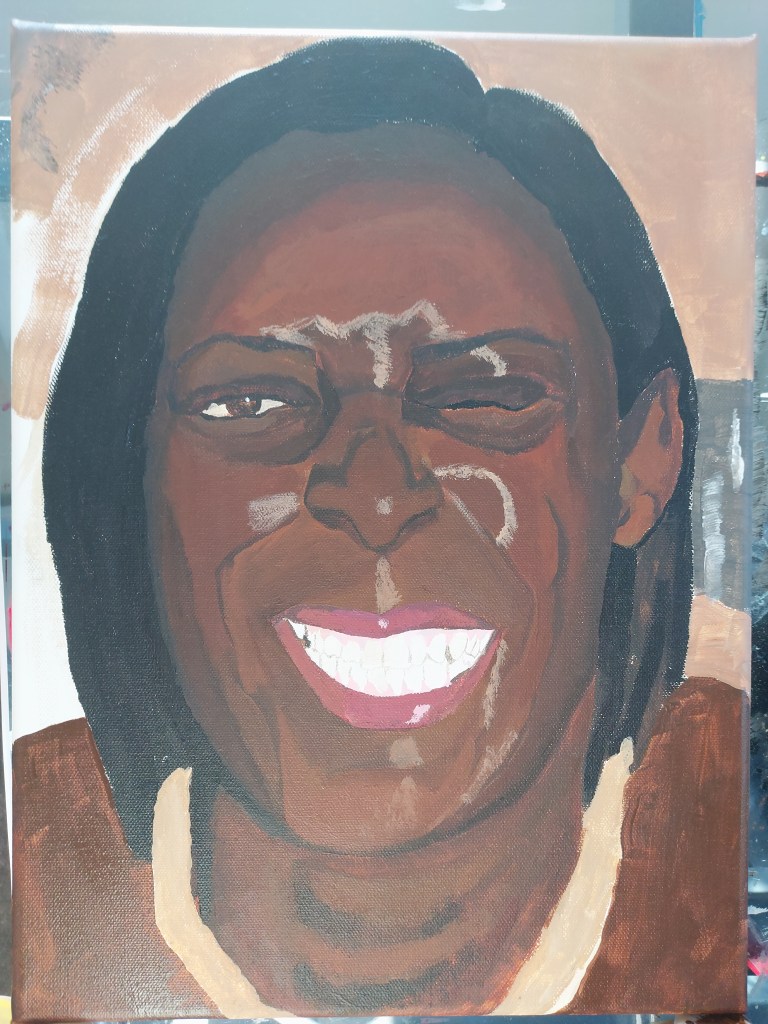 I keep assessing the image and trying to build up the depth, detail and accurate tones but I’m finding it hard. I felt I would move forward trying to gain more likeness. I added pink to the gums and the darkness surrounding the teeth which helps bring out more character in the painting. I focused then on the details such as the eyes, beauty marks, details on the collar and some colour in the background. I added light to areas on the skin tone and felt fairly defeated by this piece.