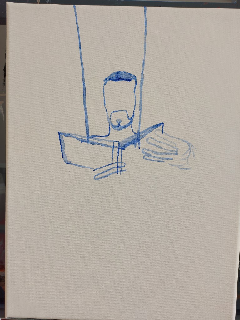 I changed the colouring of the sheet draped on the armchair. I used warm grey and created shadow with payne’s grey. I painted the window with white and a mix of buff titanium for the window frame and used a cool blue to add some shape. I also created a slight edge around the frame. I mix more colours onto my palette and added tone, highlight and shadow onto the skin. I also began adding black to the book andand was able to add features to the face. I used ultramarine blue and mars black to the curtain.