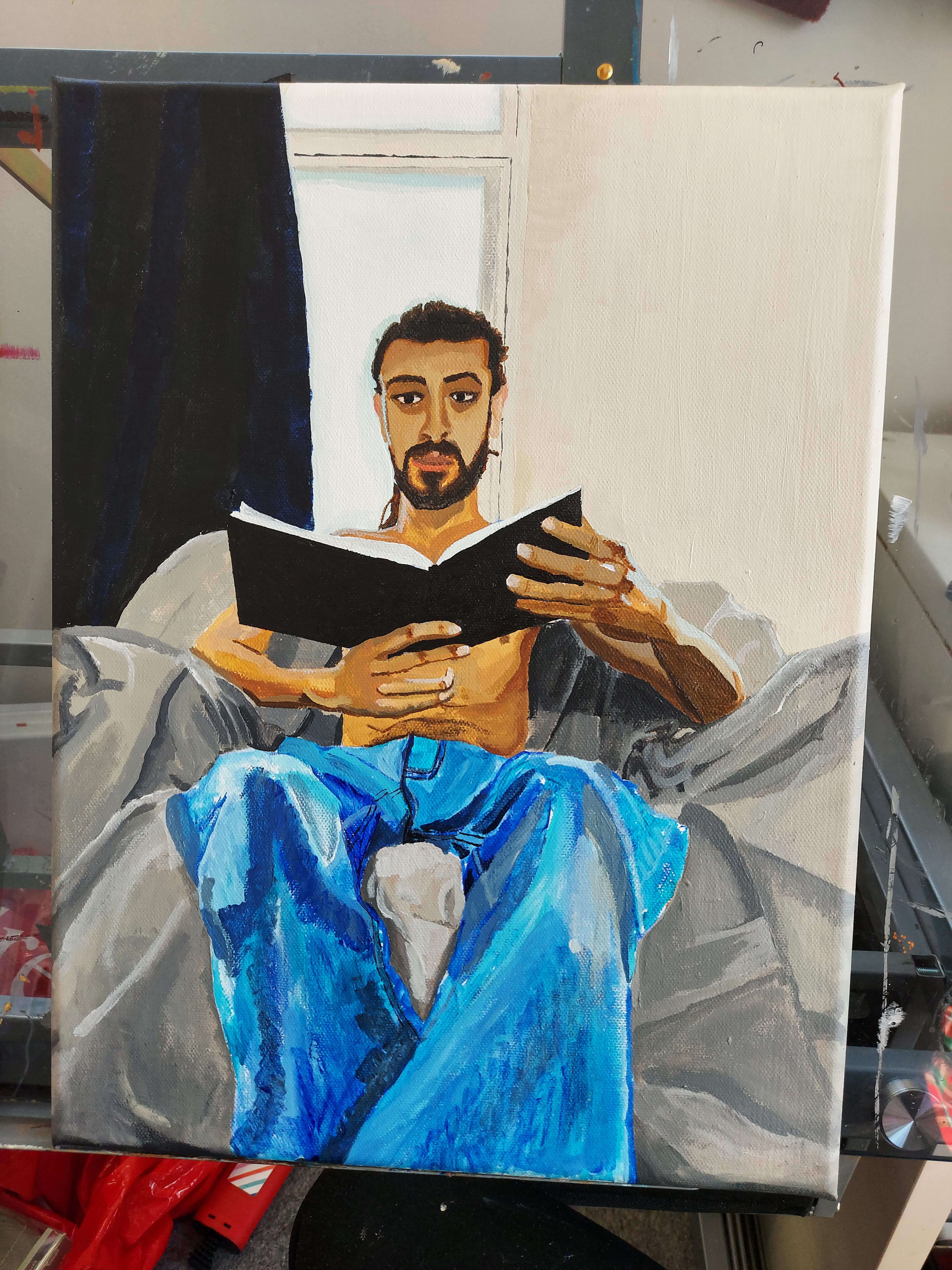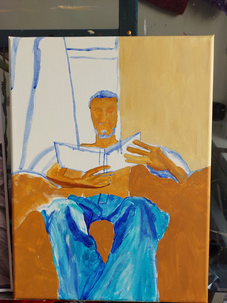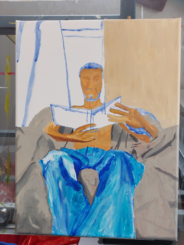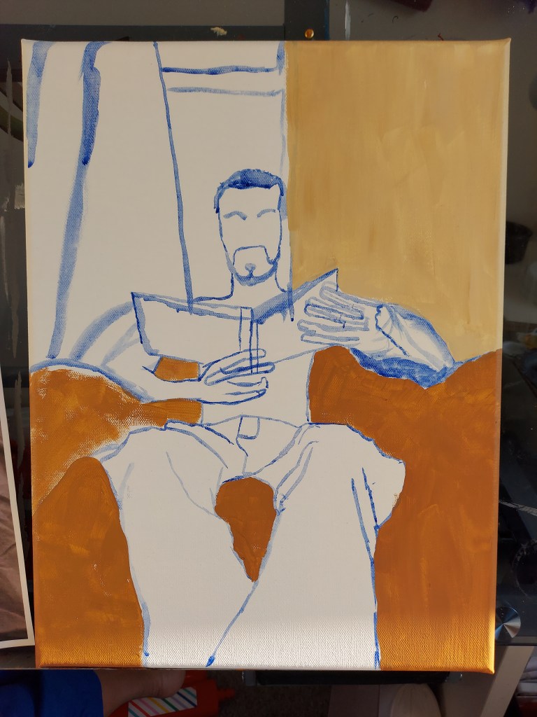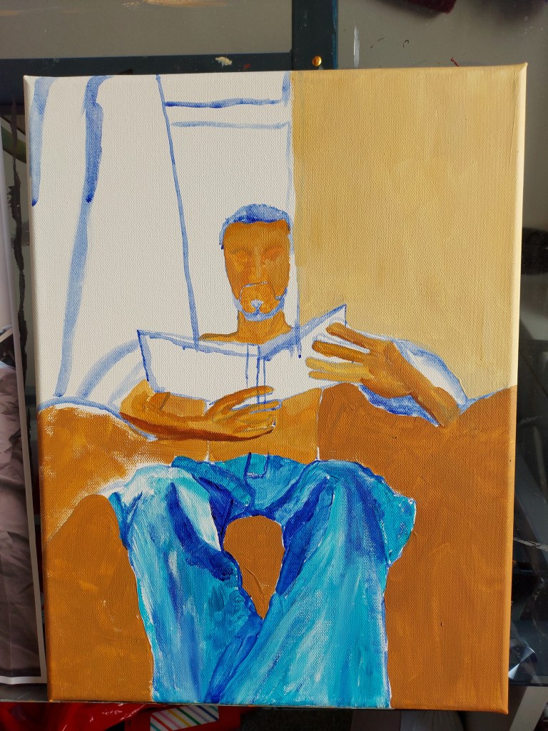 I have chosen to work with a photography with my model, he is reading a book by a window on a throw covered armchair. I have two sources of light one we can see and the other is just out of view. This adds some clear highlights which I am hoping depicts space around him. The colouring is simple and reverts focus from the background to my model.