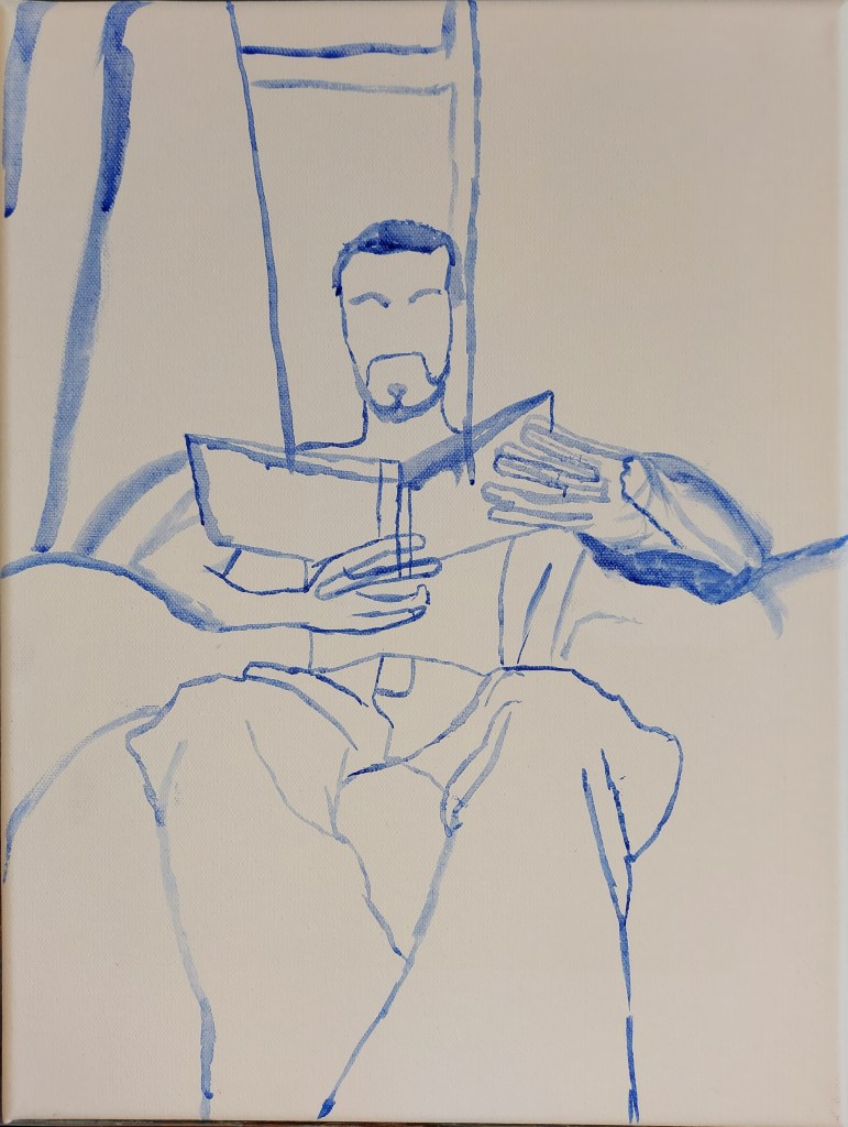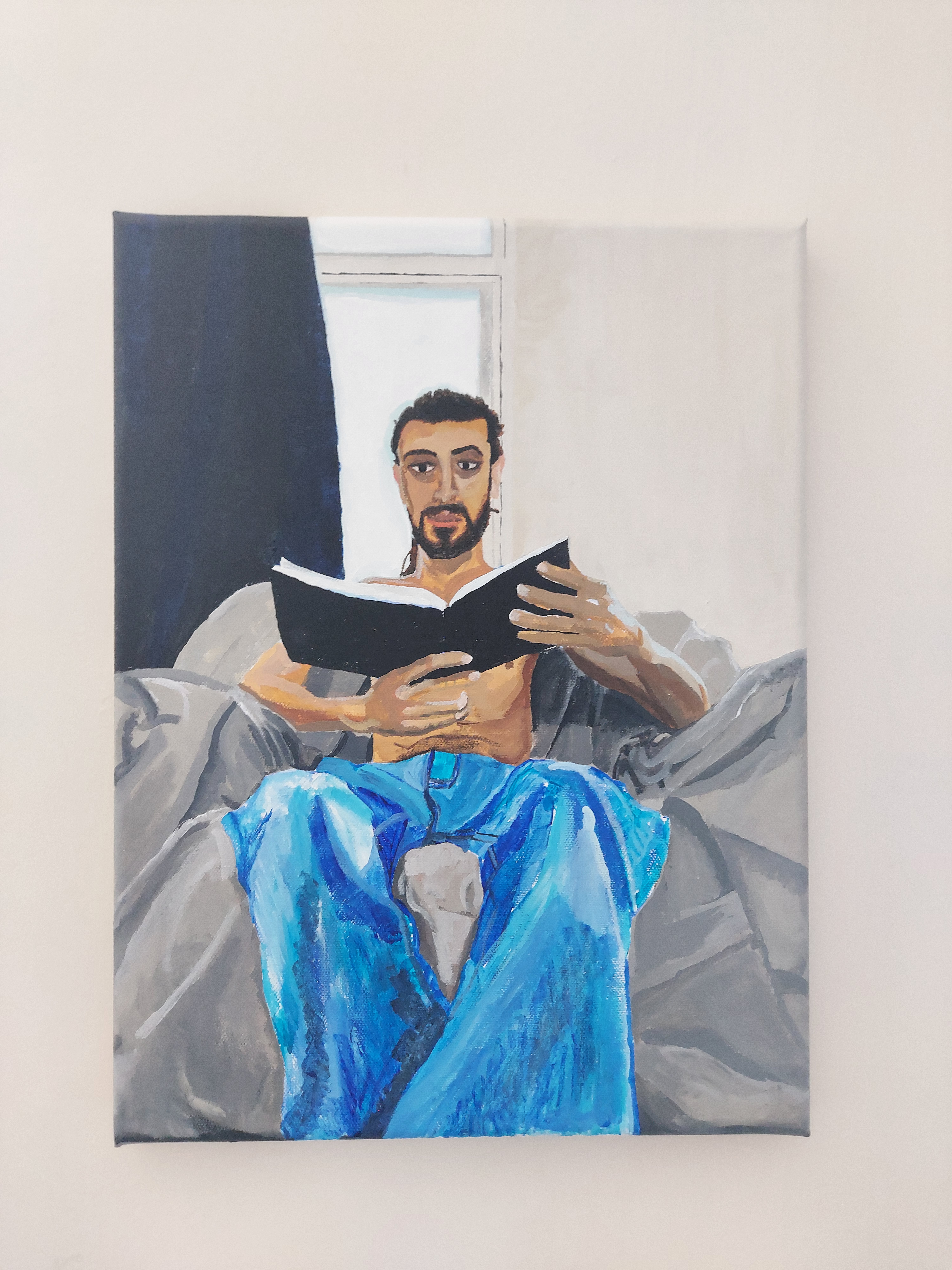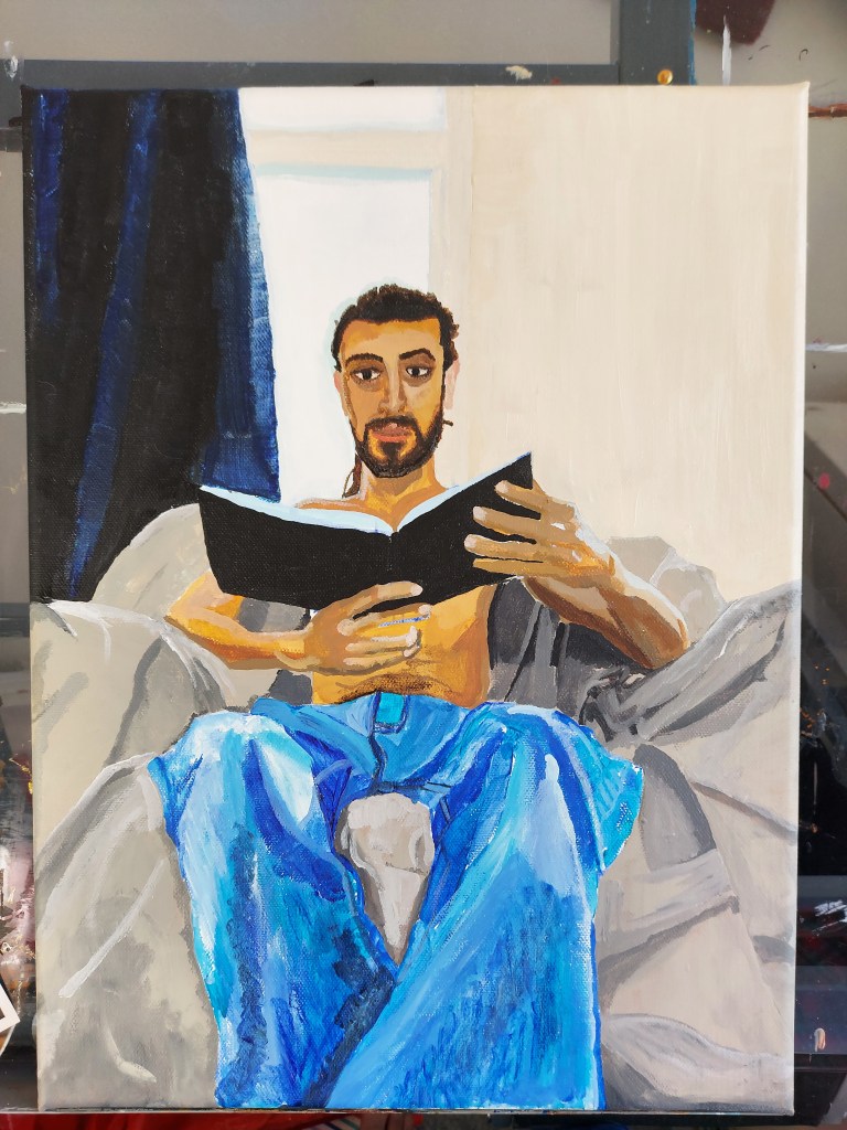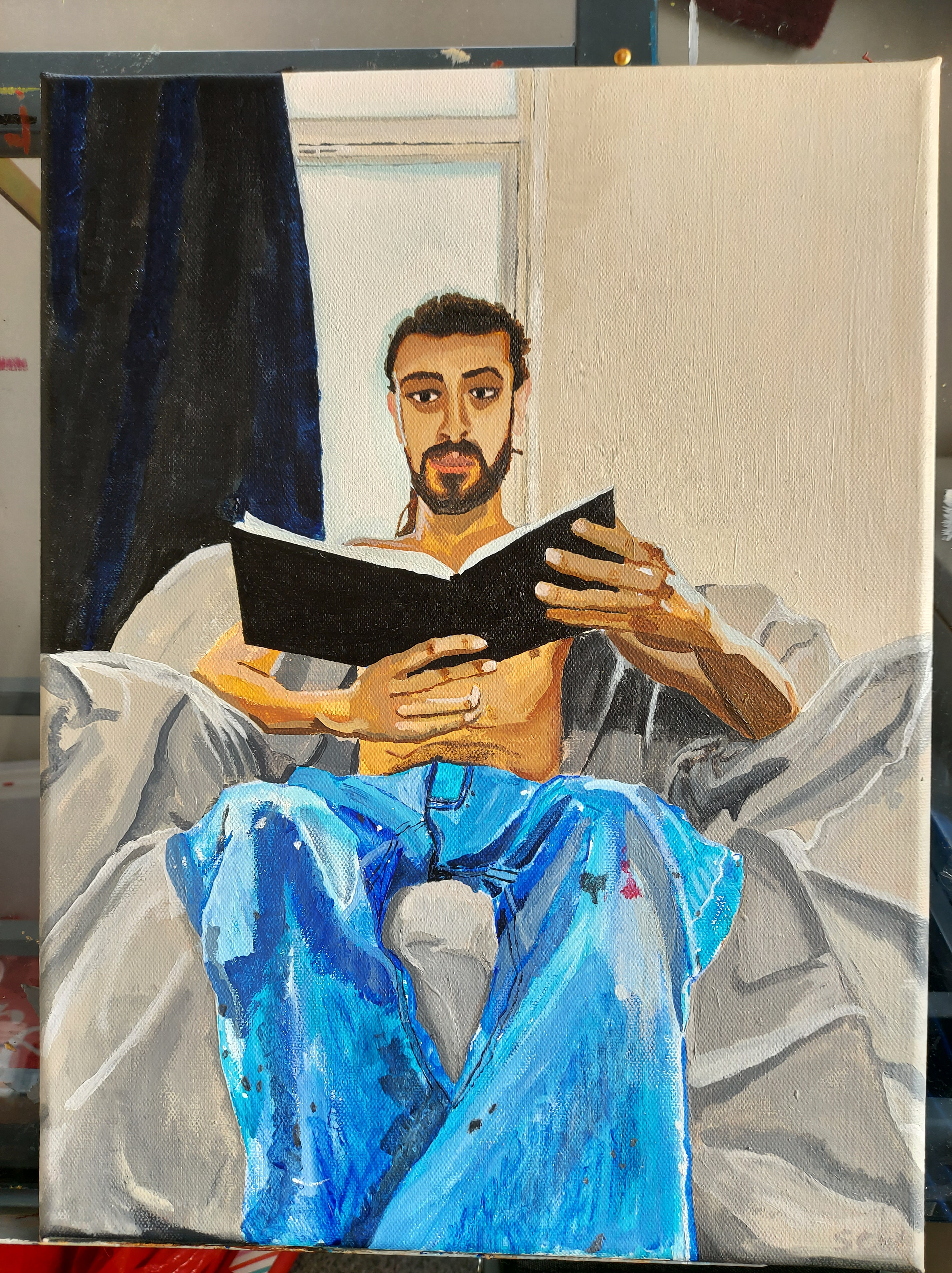 I have chosen to work with a photography with my model, he is reading a book by a window on a throw covered armchair. I have two sources of light one we can see and the other is just out of view. This adds some clear highlights which I am hoping depicts space around him. The colouring is simple and reverts focus from the background to my model.