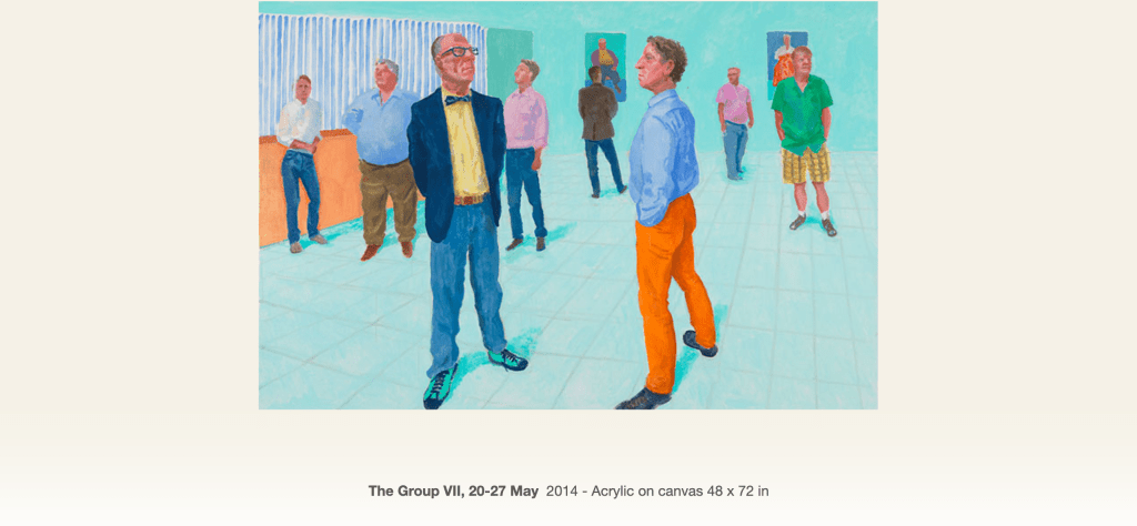 The Group VII, 20-27 May is a painting of people viewing artwork in a gallery, the colours are bright and bold. Every person is unique, they are spaced out in a large room. This is apparent by the line of the tiled floor. I feel like this is an exploratory piece by David Hockney. It is a view into his world of art shows. The pieces on the wall are visibly his work and I was able to find them in his gallery of works, specifically 82 Portraits and 1 Still Life . I love the boldness of this piece and how it gives us multiple people to look at without crowding the image. Each person is completely unique, size differences, hair styles and colours and direction. Then we’re also drawn to the background as there are works on the wall. I could stare at this painting for hours, looking at all the details.