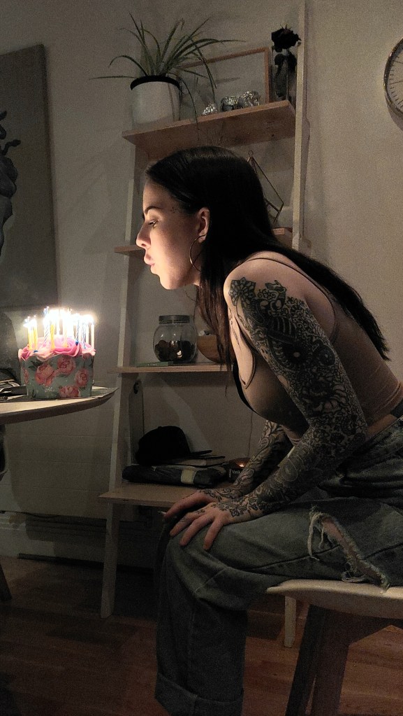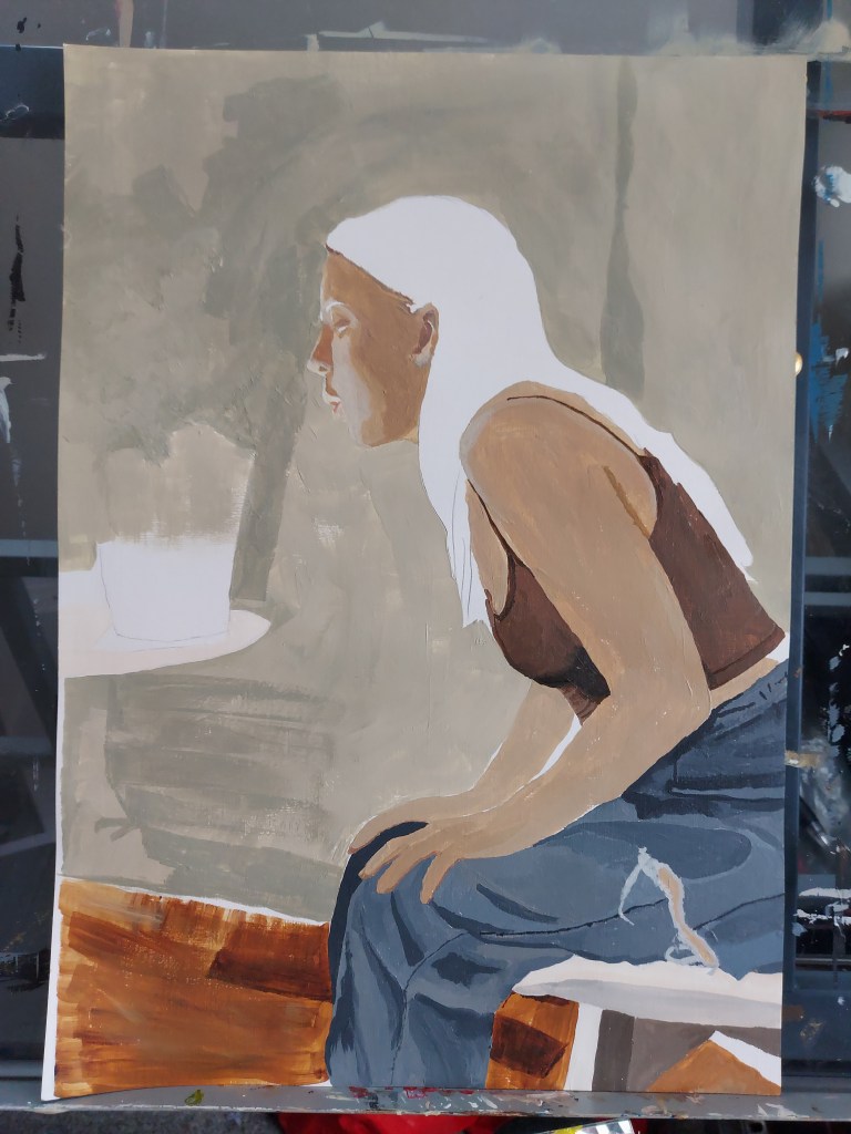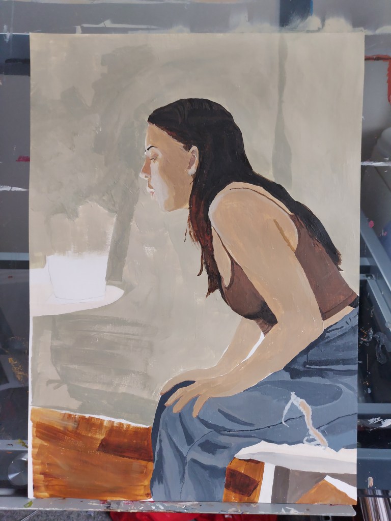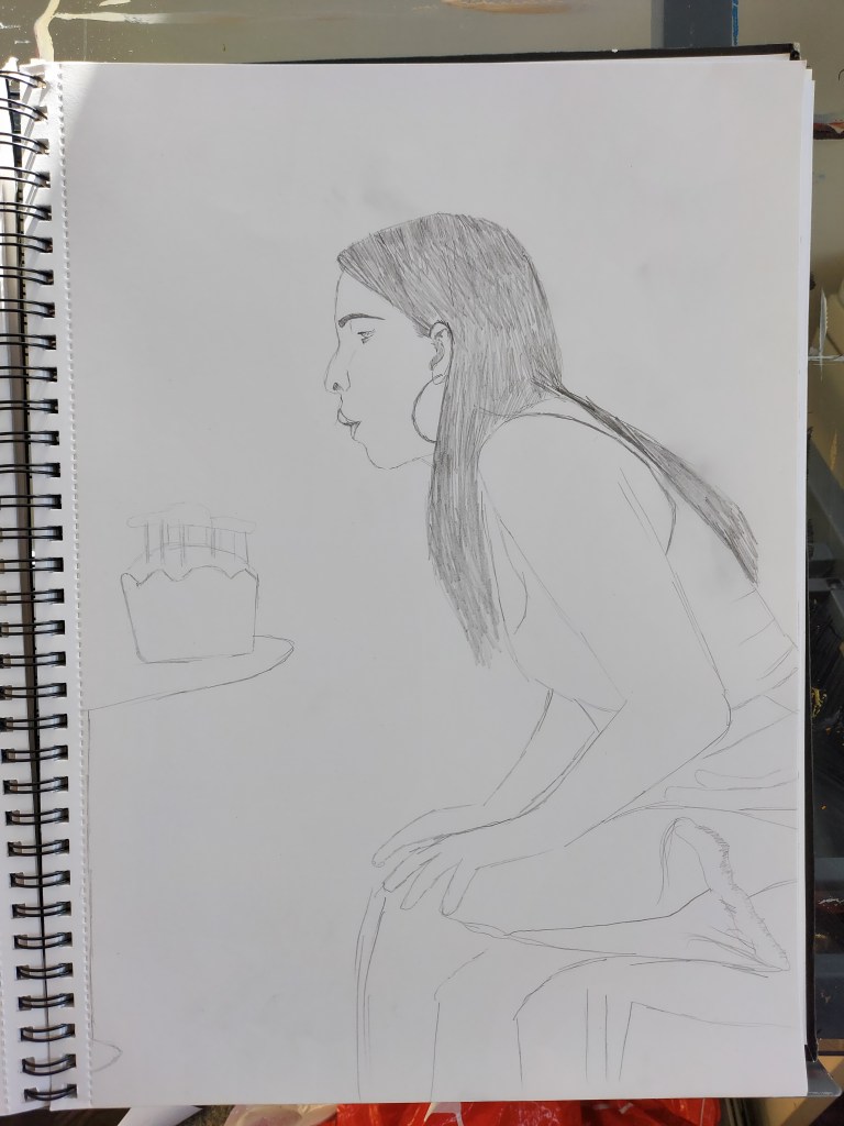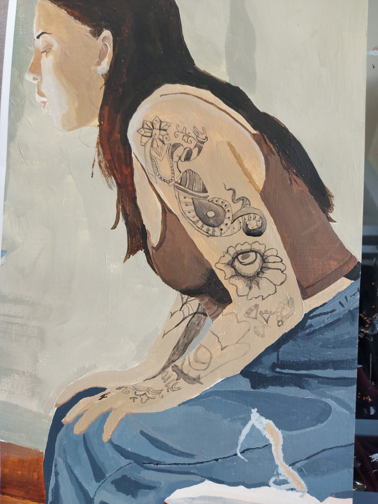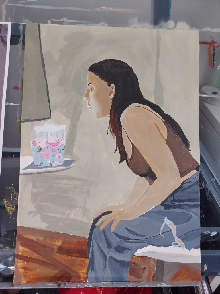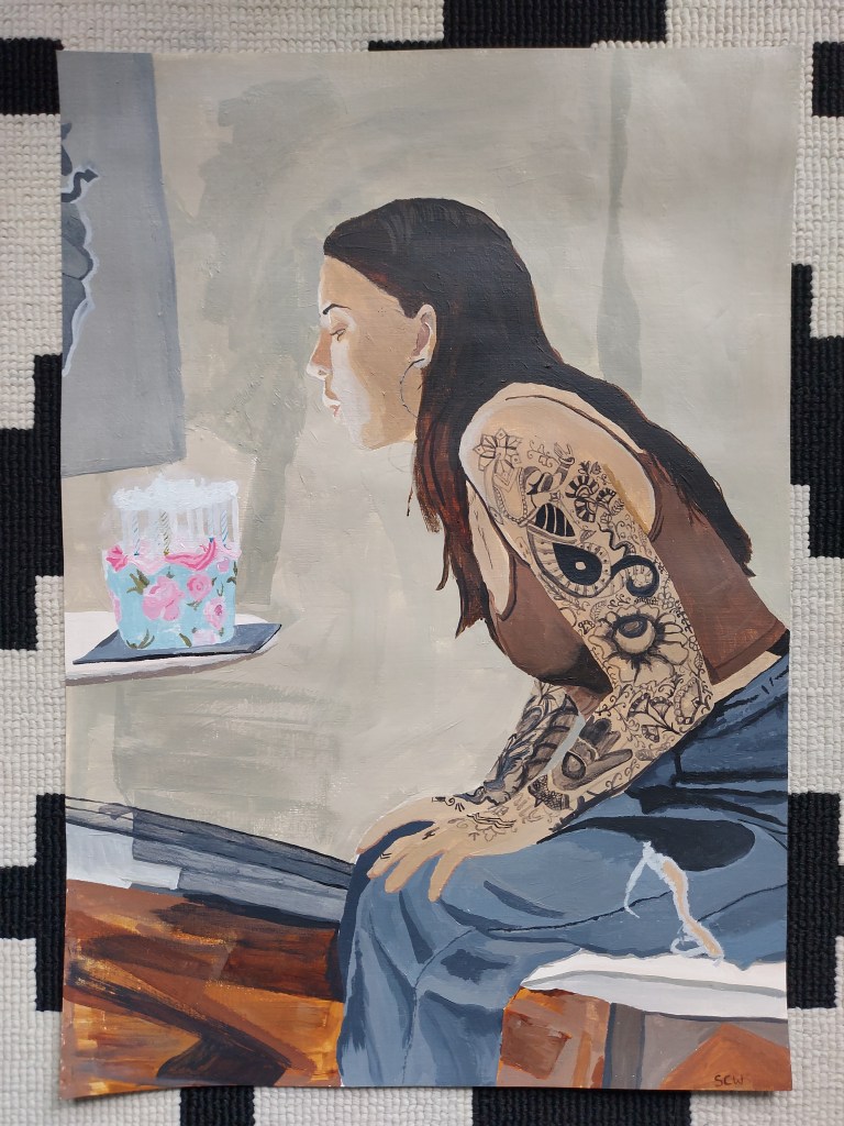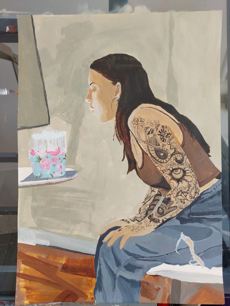 I am so pleased with this painting, I feel as though I am right there with the model watching her blow out candles. The view is restricted so the viewers is focused on this moment but also has details that allow the viewer to explore the heavily tattooed arms and the possibility of what is on the painting in the background. The colours are dark but I feel the candles add a glow to the image which brightens it up both visually and emotionally.