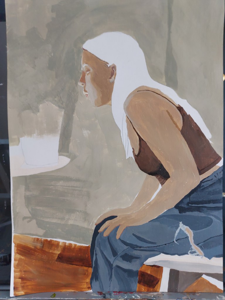 Next, I created the browns I would use to make the top and hair. When painting where the top and hair meet I left a loose edge to allow me to define the lines when I focus on the hair. The brown creates a very dark shadow under the breast and I added the hem details which I also created the same tones in the hair as I noticed how brown the ends looked and will add loose hair details later. I created some light grey and brown tones to paint the chair which leads me to painting the table in preparation for the cake.