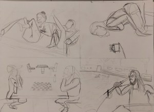 I ended up loosely sketching four images. (From left to right, Up then down) 1. Two ladies laughing, sitting on a sofa 2. A lady blowing out candles on her birthday cake. 3. A young boy and man playing checkers 4. A man rowing a boat in a canal.